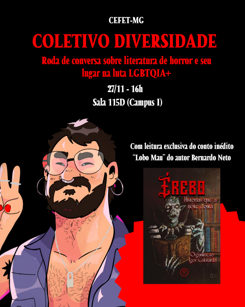 Hoje, dia 27 de novembro (quinta-feira), ocorrerá a Roda de Conversa sobre literatura de horror e seu lugar na luta LGBTQIA+, com membros do Coletivo Diversidade do Campus Nova Suíça.